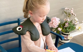 Skulderpuden Camo er udviklet til at give børn en følelse af ro og tryghed – for eksempel i skolesituationer, hvor det kan være udfordrende at bevare koncentrationen. Med en behagelig vægt på enten 1,4 kg eller 1,8 kg lægger Camo sig som en blid hånd på hver skulder og bidrager til indre ro og bedre fokus.