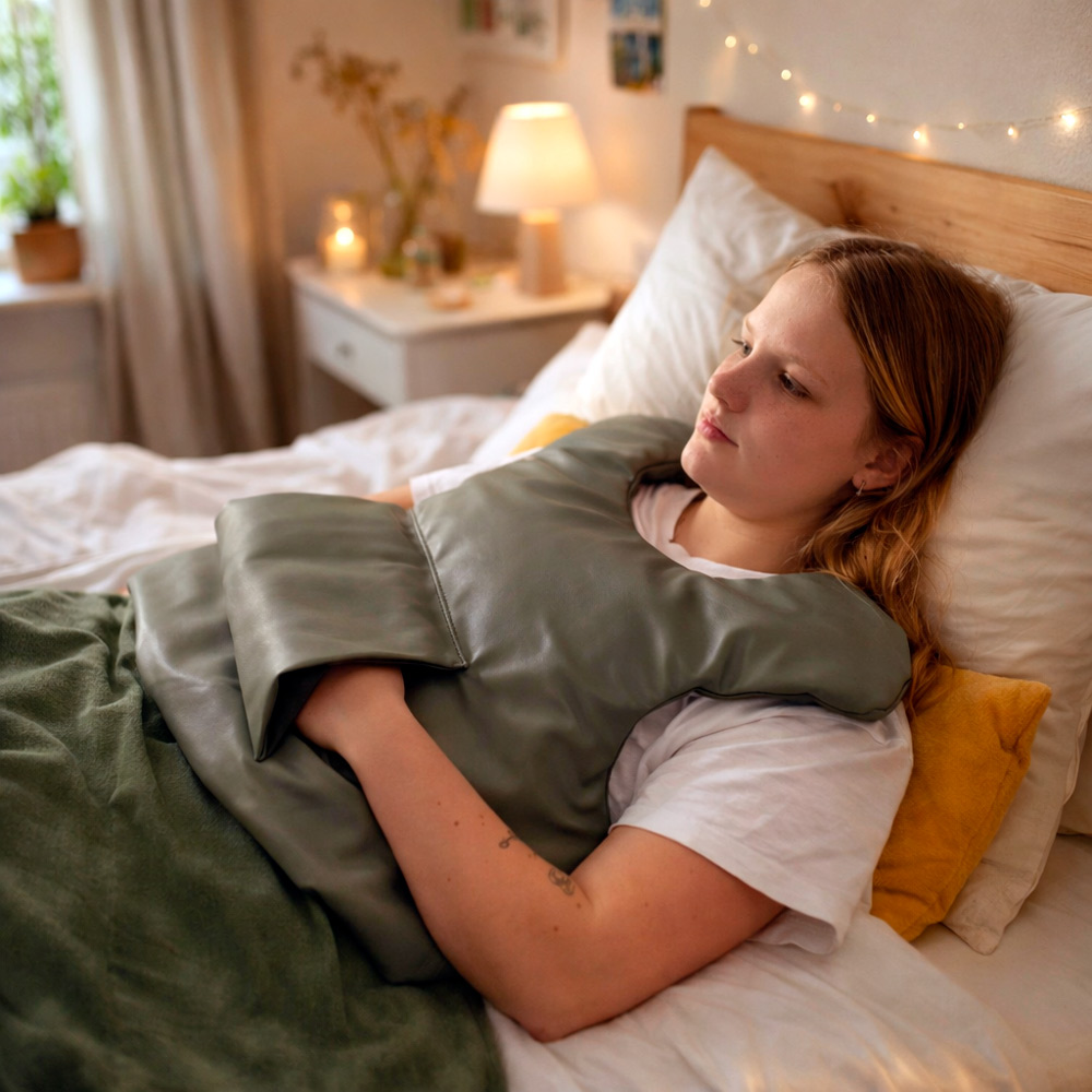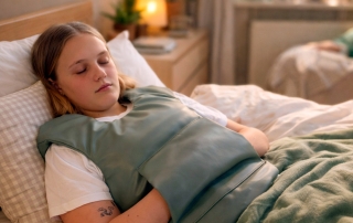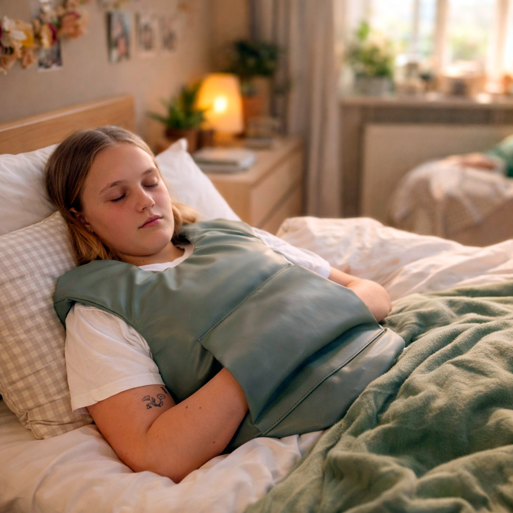 Med sit ensartede tryk giver Trygge Max en følelse af kropsbevidsthed og tryghed. – Tyngde påvirker ligeså muskel-led sansen og frigiver oxytozin, som er kroppens eget afstressende hormon. Vær særlig opmærksom på at brugen af Trygge Max vil altid være på eget ansvar. Men vi giver naturligvis gerne gode råd om brugen, og vi henviser også til, at det altid er en optimal løsning at søge hjælp hos fagpersoner om brugen af produktet.
